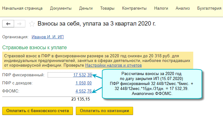 Добавлена возможность расчета фиксированных страховых взносов ИП за себя на дату закрытия или перехода в самозанятые.