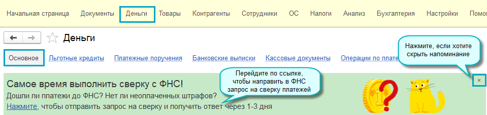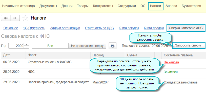 Простой интерфейс: меню "Налоги - Сверка налогов с ФНС".