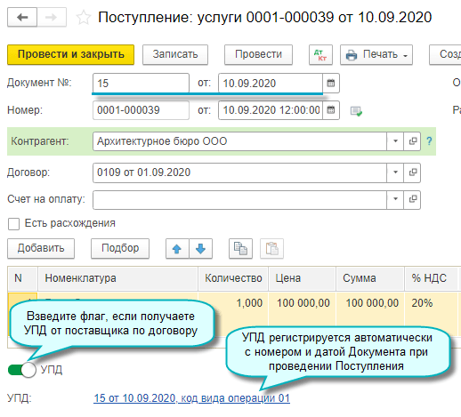 Добавлена возможность при получении или выдаче УПД не регистрировать отдельно Счета-фактуры. Достаточно сделать настройку для контрагента и договора в одном документе, и она будет применяться в последующих.
