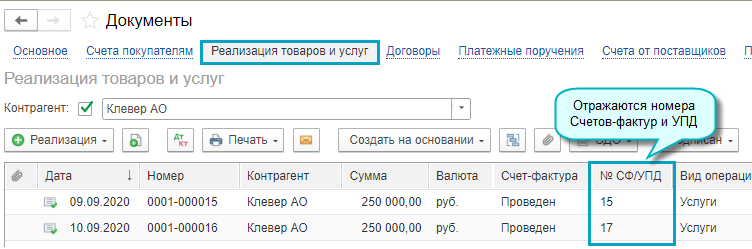 Добавлена информация о номерах Счетов-фактур и УПД в журнал документов по реализации товаров и услуг.