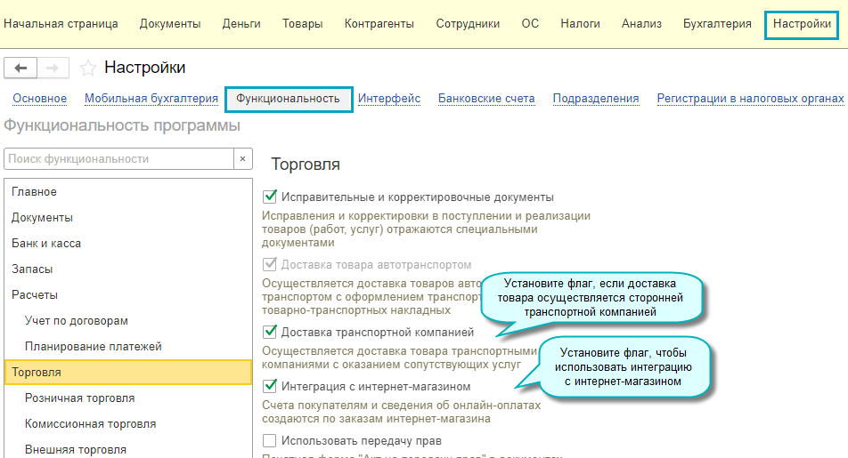Полный интерфейс: меню "Администрирование - Настройки программы - Функциональность - Торговля".