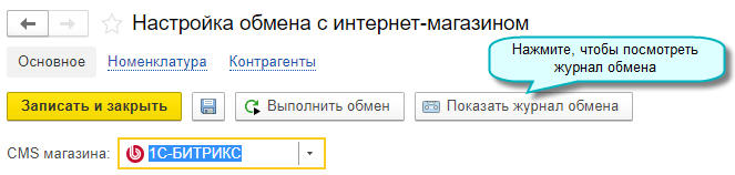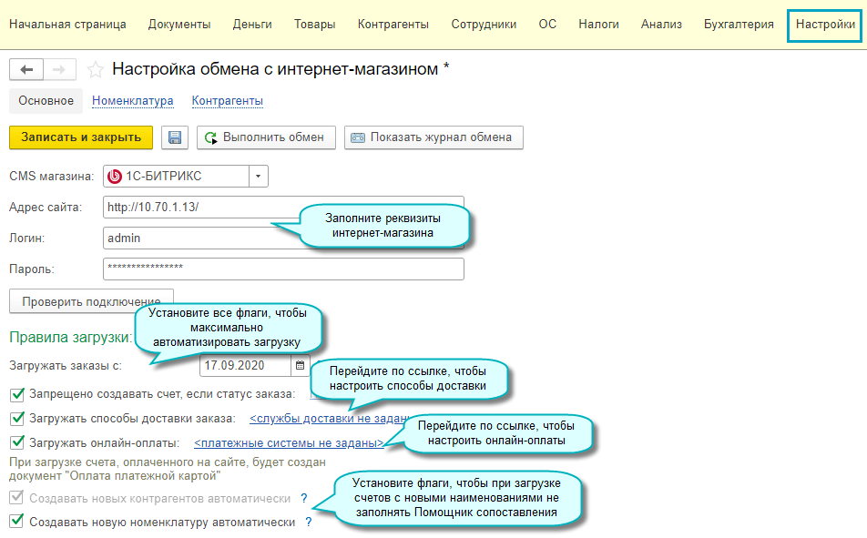 Полный интерфейс: меню "Администрирование - Настройки программы - Настройки обмена с интернет-магазином".