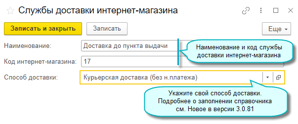 Добавлен сервис интеграции с интернет-магазином. Он позволяет загружать полную информацию о заказе покупателя с сайта магазина. Автоматизирована загрузка информации о способе доставки товара, в том числе сторонними транспортными компаниями, и онлайн-оплате на сайте магазина.