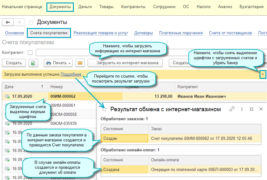 Простой интерфейс: меню "Документы - Основное или Счета покупателям".