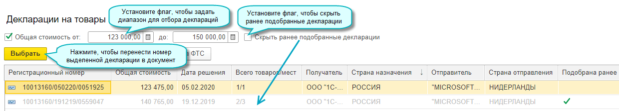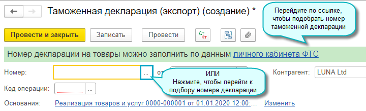 Добавлена возможность подбора номера таможенной декларации по экспортным операциям из данных личного кабинета Федеральной таможенной службы (ФТС).