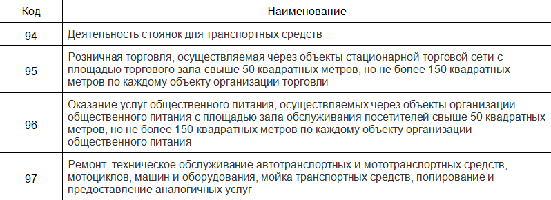 Перечень видов деятельности для таких патентов представлен в таблице.