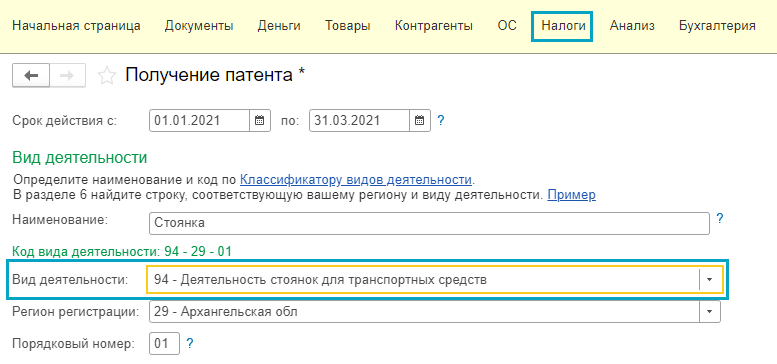 Полный интерфейс: меню "Главное - Настройки - Налоги и отчеты - Настройка налогов и отчетов - Патенты - Заявление на получение патента".