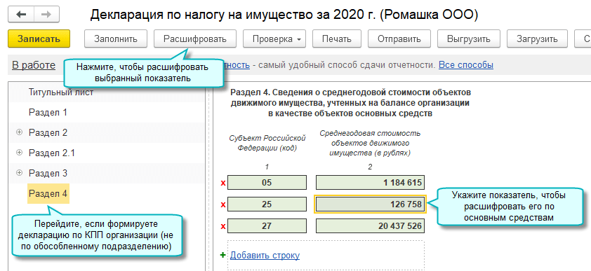 Добавлено автозаполнение и расшифровка сведений о стоимости движимого имущества в декларации по налогу на имущество в редакции приказа ФНС России от 09.12.2020 № КЧ-7-21/889@. Форма обязательна к применению с 14.03.2021 начиная с отчета за 2020 год.