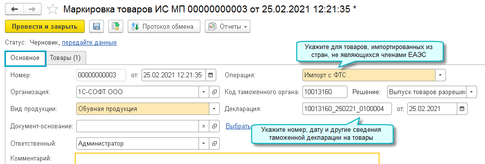 Добавлена возможность маркировки товаров, импортированных из стран, не являющихся членами ЕАЭС.