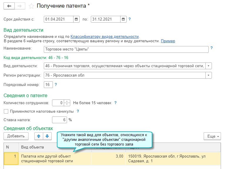 В помощнике заполнения заявления на патент учтены рекомендации ФНС для розничной торговли через торговые места и другие объекты стационарной торговой сети без торговых залов. Эти объекты прямо не указаны в действующем порядке заполнения заявления, поэтому для них нужно использовать код вида объекта "14 - Палатка" (Письмо ФНС РФ от 15.02.2021 № СД-4-3/1846@). Подробнее см. в Статье.