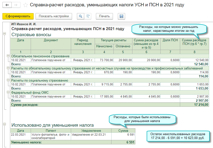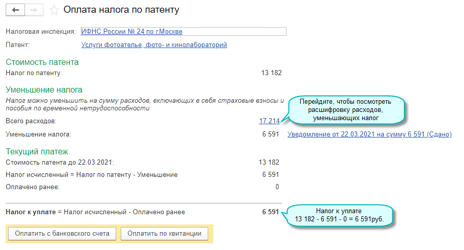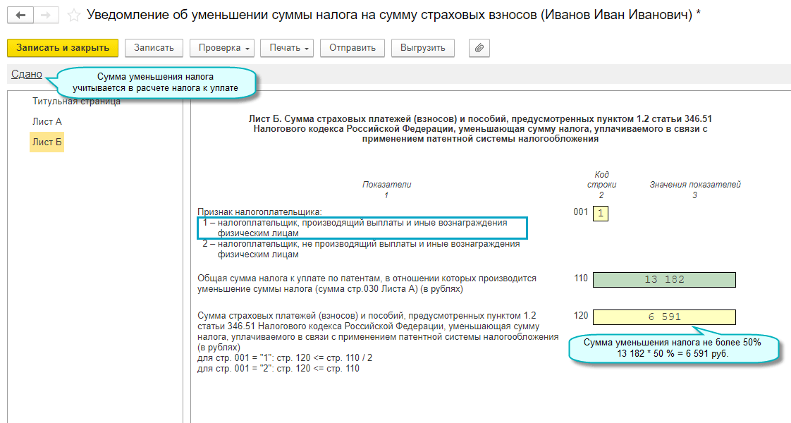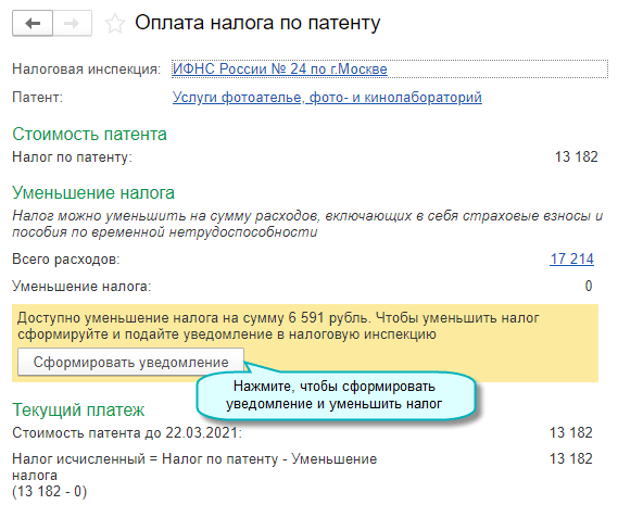Добавлена возможность подготовить уведомление об уменьшении суммы налога по патенту. С 2021 года налог можно уменьшить на расходы на страховые взносы и пособия, если они уплачены за работников, занятых в деятельности, по которой применяется ПСН. Предприниматели, использующие труд работников, вправе уменьшить сумму налога не более чем на 50 %. Если работников у предпринимателя нет, то он вправе уменьшить сумму налога на уплаченные за себя страховые взносы без ограничения (Федеральный закон от 23.11.2020 № 373-ФЗ, Письмо ФНС от 26.01.2021 № СД-4-3-785@).