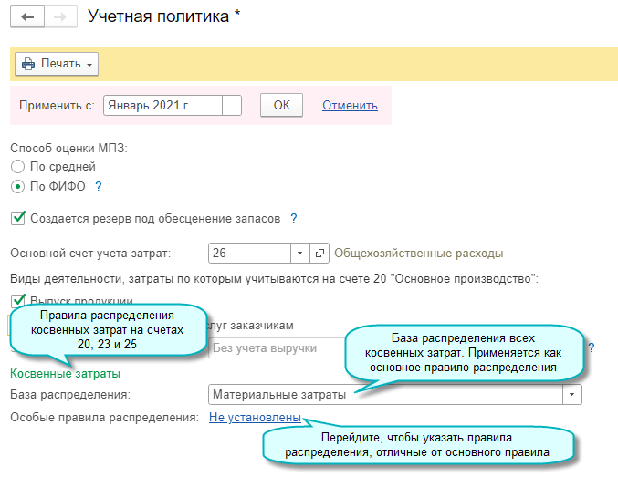 Внесены изменения в настройки распределения косвенных затрат. С 2021 года косвенными считаются затраты, которые не могут быть прямо отнесены к конкретной продукции, работе, услуге (п. 24, 25 ФСБУ 5/2019 "Запасы"). Подробнее см. видео.