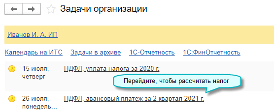 Простой интерфейс: меню "Бухгалтерия - Закрытие периода - Закрытие месяца - Расчет НДФЛ для ИП".