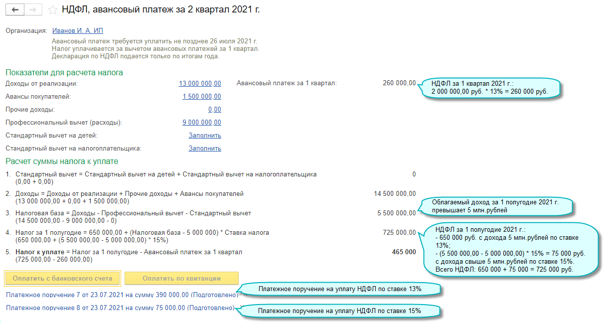 Также добавлено автозаполнение платежных поручений на уплату НДФЛ по ставке 15%.