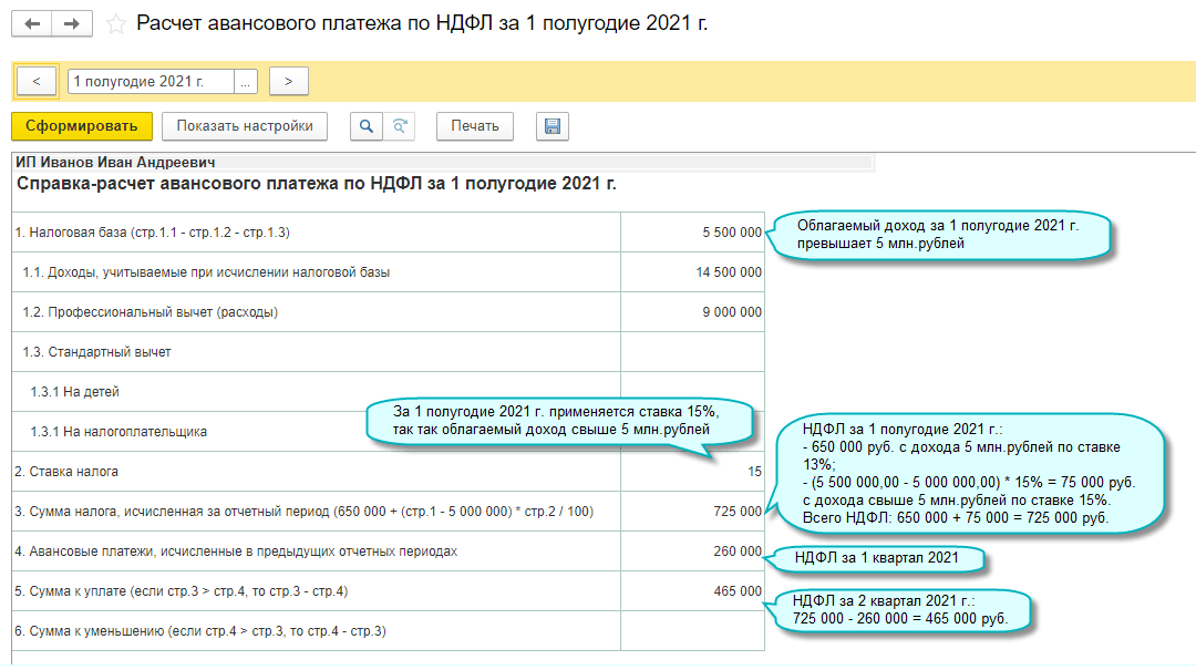 Добавлена возможность расчета авансовых платежей по НДФЛ индивидуального предпринимателя по прогрессивной шкале. С 01.01.2021 с доходов больше 5 млн. рублей, уплачивается НДФЛ по повышенной ставке 15%. НДФЛ составит 650 000 руб. плюс 15% с суммы превышения 5 млн. рублей (Федеральный закон от 23.11.2020 № 372-ФЗ).