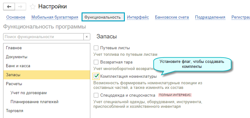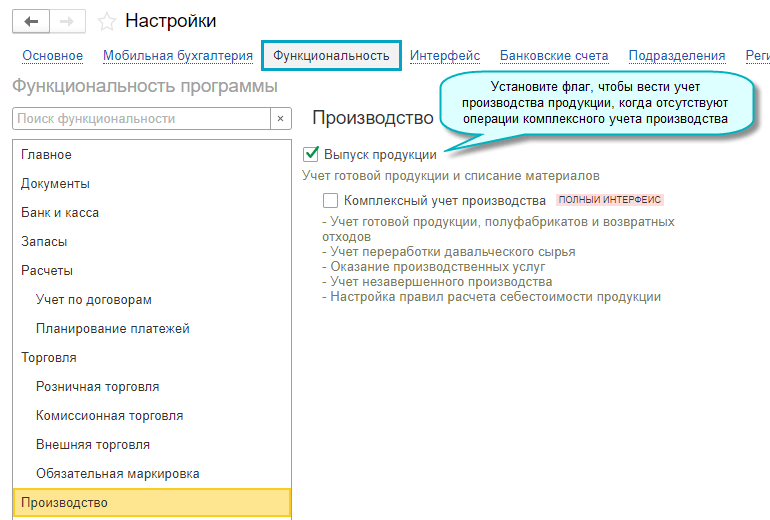 Полный интерфейс: меню "Главное - Настройки - Функциональность - Производство".