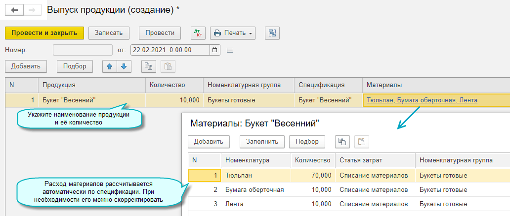 В простом интерфейсе добавлена возможность вести учет производства продукции. В прошлых версиях это было доступно только в полном интерфейсе. Документом "Выпуск продукции" отражаются в учете выпуск продукции и расход материалов. Использовать его можно для учета продукции, в производстве которой нет полуфабрикатов, возвратных отходов, незавершенного производства и других операций комплексного учета производства.