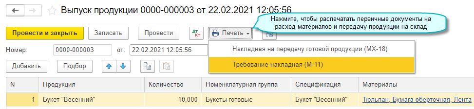 Простой интерфейс: меню "Товары - Выпуск продукции".