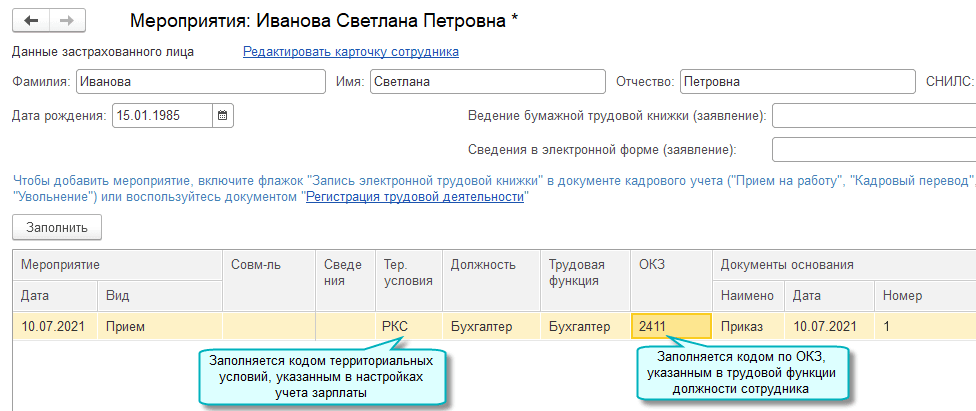 Подробнее о заполнении по сотруднику кода трудовой функции по ОКЗ см. в описании Нового в версии 3.0.90.