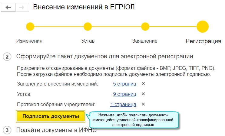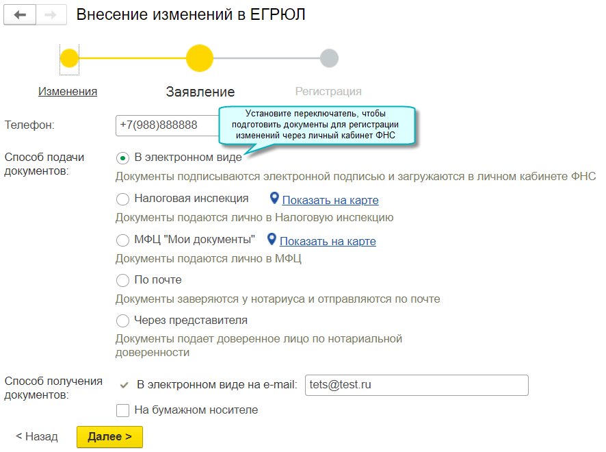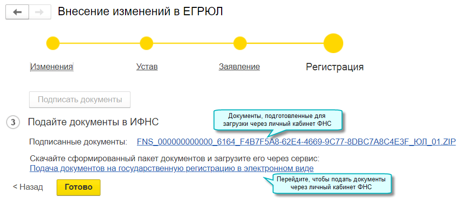Добавлена возможность подготовить документы для регистрации изменений в ЕГРЮЛ, ЕГРИП через личный кабинет ФНС. Для этого необходима усиленная квалифицированная электронная подпись, например, используемая в 1С-Отчетности.