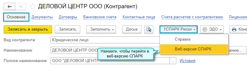 Добавлена возможность перехода к веб-версии информационной системы СПАРК с более подробной информацией о контрагенте. Функционал доступен для пользователей сервиса "1СПАРК Риски +".