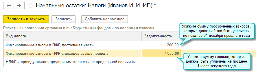 Добавлена возможность ввода остатков по фиксированным взносам ИП в ПФР за себя по видам взносов. Такой учет необходим из-за отличающихся сроков уплаты взносов.