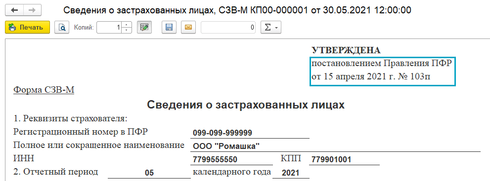 Добавлена печатная форма "Сведения о застрахованных лицах (СЗВ-М)", утвержденная Постановлением Правления ПФ РФ от 15.04.2021 № 103п. Форма применяется с 30.05.2021.