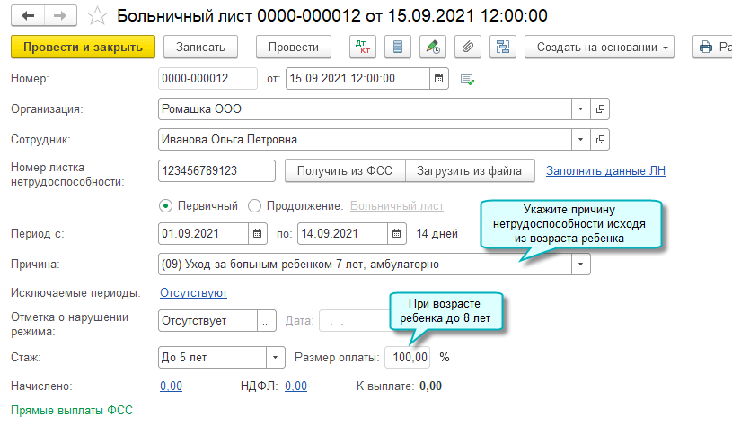 С 01.09.2021 изменен размер пособия по временной нетрудоспособности по уходу за ребенком в возрасте до 8 лет. Пособие оплачивается в размере 100 % среднего заработка независимо от продолжительности страхового стажа и количества дней нетрудоспособности (Федеральный закон от 26.05.2021 № 151-ФЗ).
