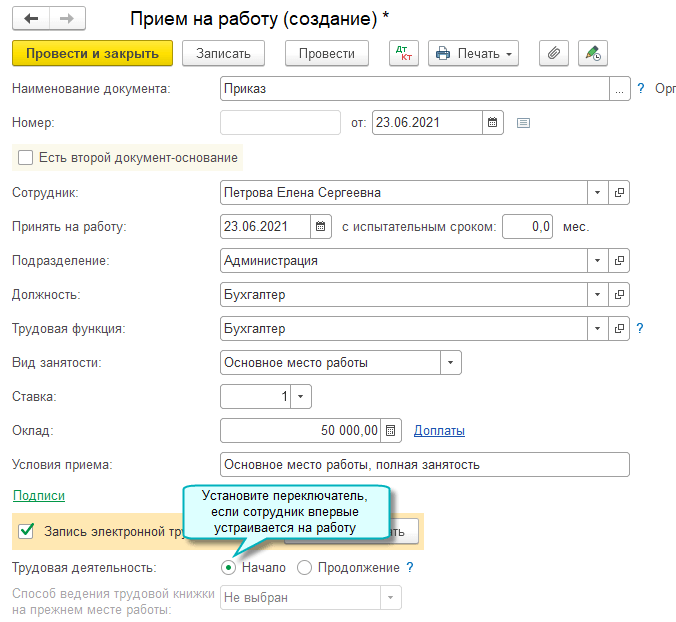 При приеме сотрудника на работу после 01.01.2021 добавлена возможность указать, что это его первое место работы. Трудовая книжка такого сотрудника ведется только в электронном виде, бумажная трудовая книжка не оформляется (Федеральный закон от 16.12.2019 № 439-ФЗ).