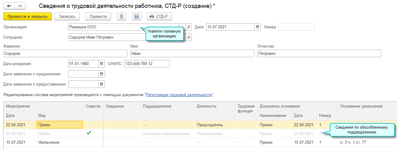 Добавлена возможность заполнения одной формы СТД-Р с учетом всех обособленных подразделений организации, в которых работал сотрудник. При этом печатные формы СТД-Р формируются отдельно по головной организации и каждому обособленному подразделению.