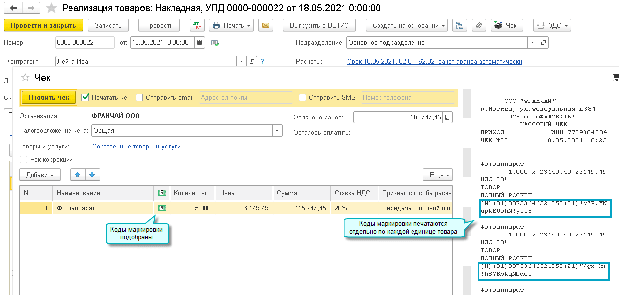 Добавлена передача в ГИС МТ кодов маркировки при печати чека по розничной продаже, оформленной документом "Реализация товаров".