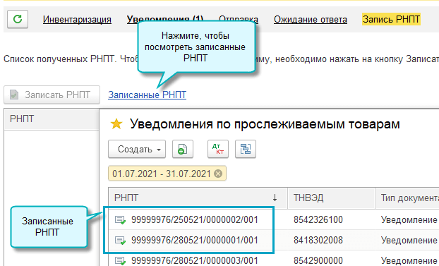 Дальнейшие получение и запись РНПТ выполняются также как при получении РНПТ на остатки товаров.