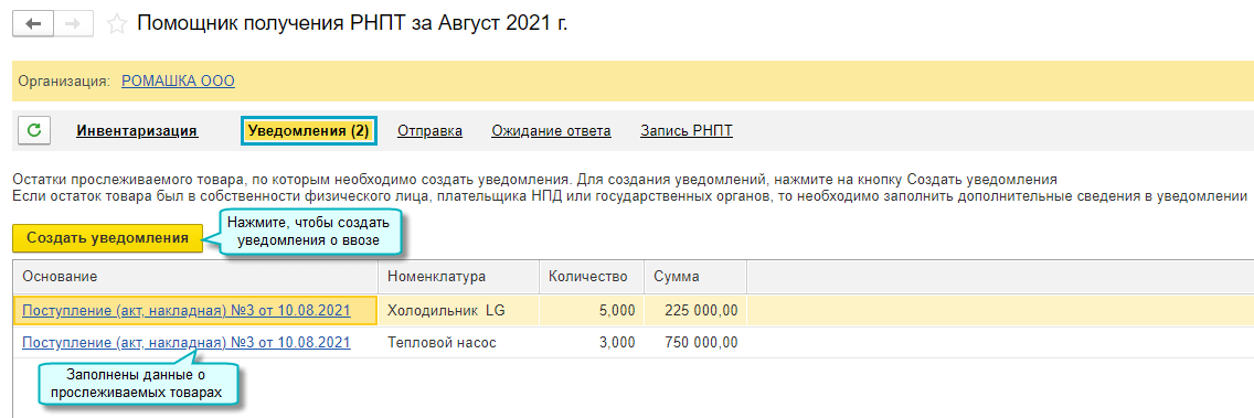 Предусмотрено напоминание о необходимости получения РНПТ в ФНС в течение 5 рабочих дней, при отражении поступления прослеживаемых товаров из стран, являющихся участниками ЕАЭС.