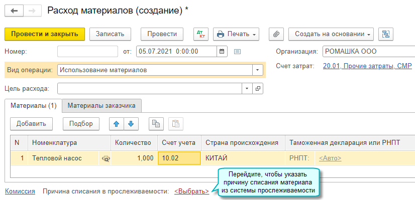 Аналогично указывается РНПТ и причина списания в документе Расход материалов с видом операции Передача сотруднику и учетом по сотруднику расходов.