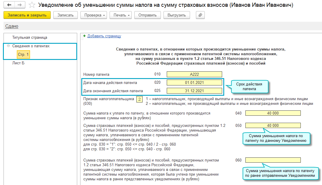 Срок действия патента добавлен в Уведомление об уменьшении стоимости патента на страховые взносы. Сумма уменьшения налога рассчитывается по каждому патенту (Приказ ФНС России от 26.03.2021 № ЕД-7-3/218@). Такая форма Уведомления применяется начиная с 12.07.2021. Подробнее об уменьшении стоимости патента на страховые взносы см. в описании Нового в версии 3.0.89.