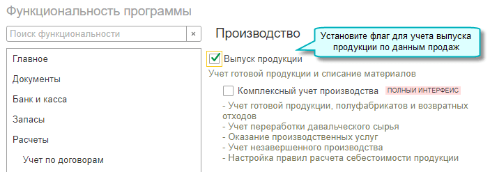 Простой интерфейс: меню "Настройки - Функциональность - Производство".