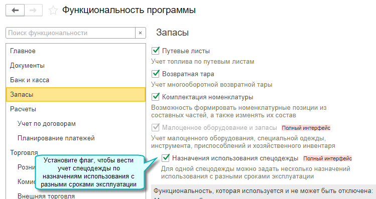 Полный интерфейс: меню "Главное - Настройки - Функциональность - Запасы".