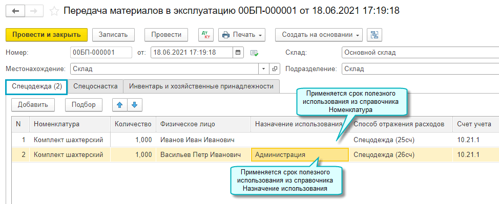 Срок полезного использования, указанный таким способом, применяется при выдаче материалов сотруднику документом "Расход материалов".
