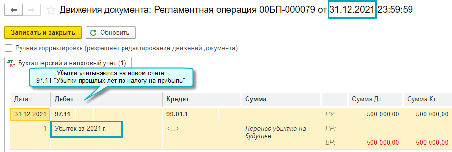 Добавлен перенос на будущее убытков по налогу на прибыль. Перенос выполняется при закрытии месяца декабря регламентной операцией Перенос убытков по налогу на прибыль (Списание убытков прошлых лет - в прошлых версиях). Функционал доступен начиная с декабря 2021 года.