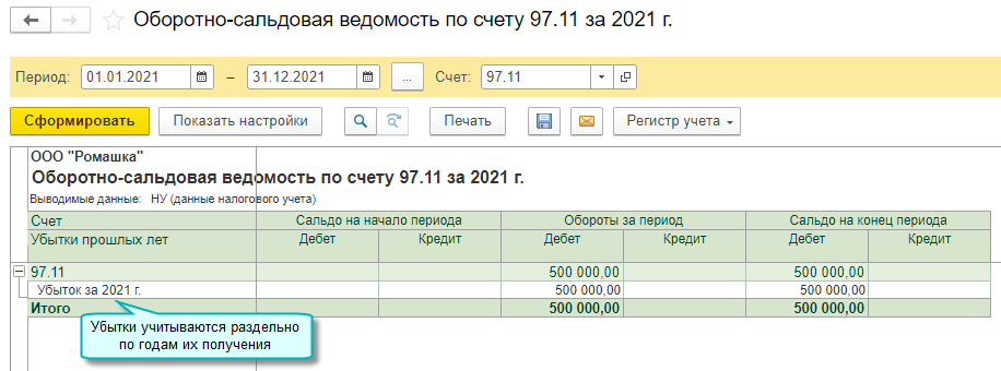 Полный интерфейс: меню "Операции - Закрытие периода - Закрытие месяца - Перенос убытков по налогу на прибыль".