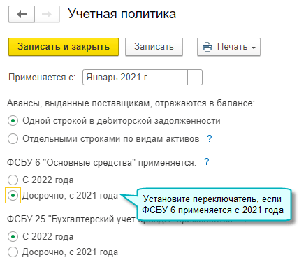 Добавлена возможность учета основных средств по ФСБУ 6/2020 "Основные средства". Правила ФСБУ 6 обязательны к применению начиная с 2022 года, но по желанию организация может начать применять стандарт раньше указанного срока (Приказ Минфина России от 17.09.2020 № 204н).