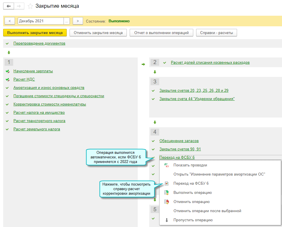 Полный интерфейс: меню "Операции - Закрытие периода - Закрытие месяца - Переход на ФСБУ 6".