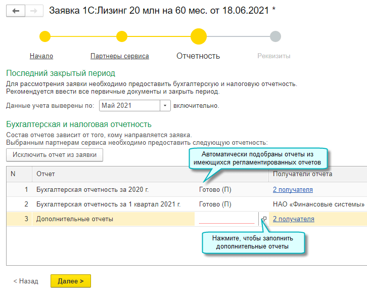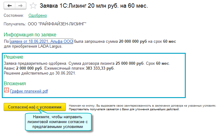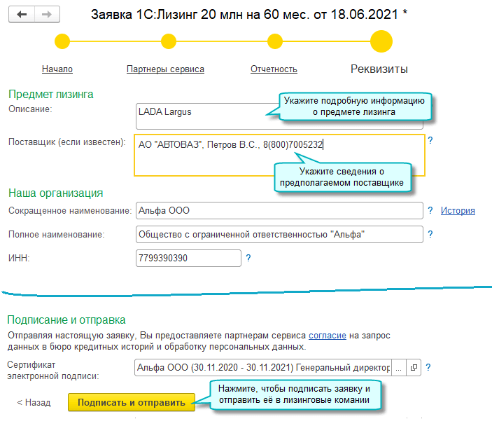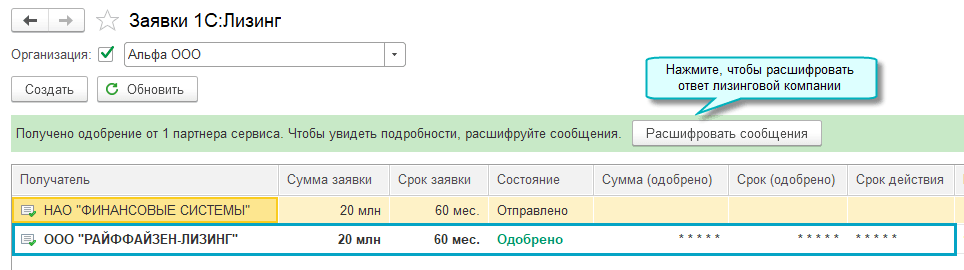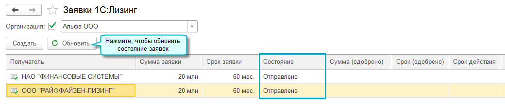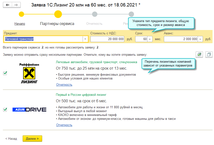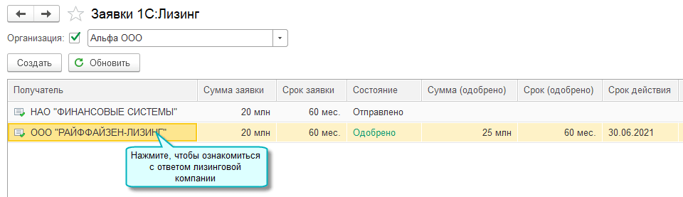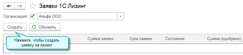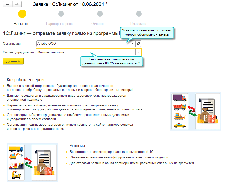 Открыт новый сервис 1С:Лизинг для отправки заявок в лизинговые компании прямо из программы. Список возможных получателей доступен непосредственно в сервисе. Для отправки заявки необходима усиленная квалифицированная электронная подпись.