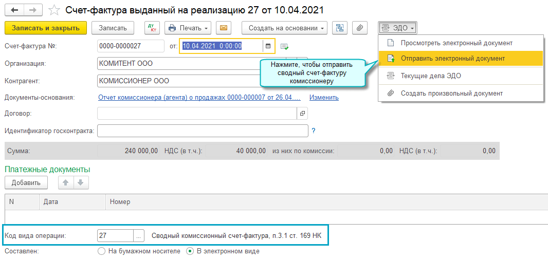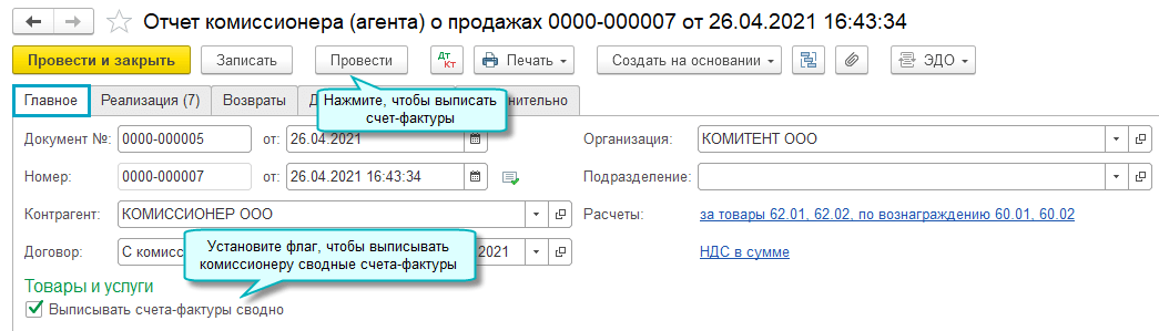 Добавлена возможность при перевыставлении счетов-фактур комиссионеру выставлять сводный счет-фактуру. В сводном счете-фактуре комитента объединяются данные по счетам-фактурам, выписанным комиссионером на одну дату.
