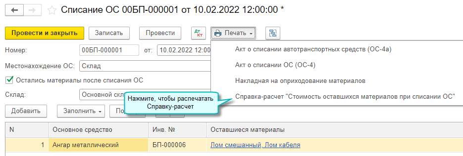 Полный интерфейс: меню "ОС и НМА - Выбытие основных средств - Списание ОС".