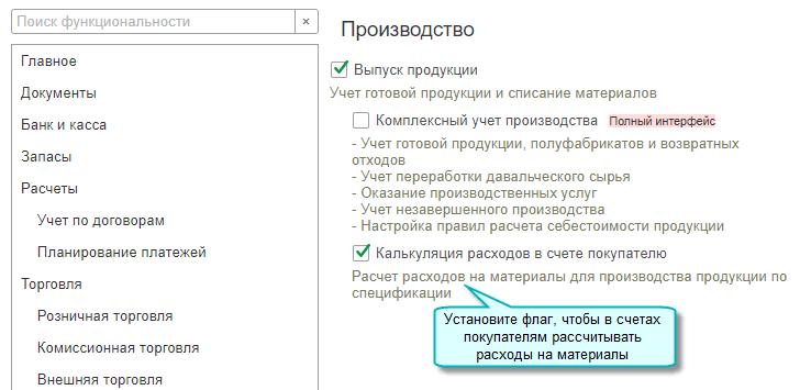 Простой интерфейс: меню "Настройки - Функциональность - Производство".