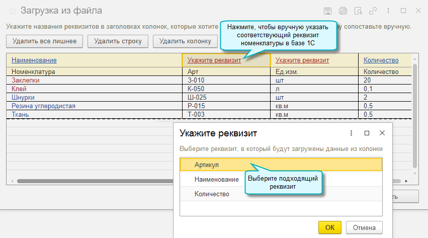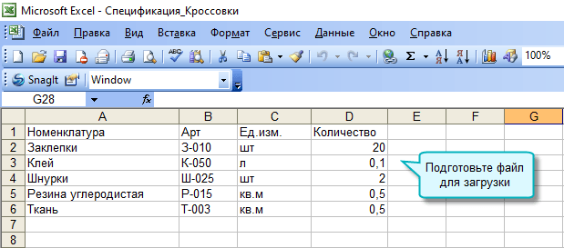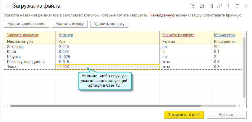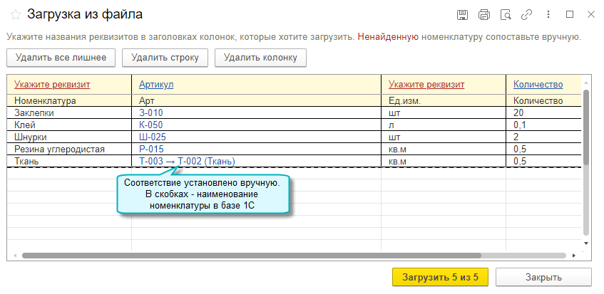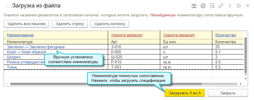 Добавлена возможность загрузки спецификации продукции из файла Excel. При загрузке доступны два варианта сопоставления номенклатуры: по наименованию или по артикулу.