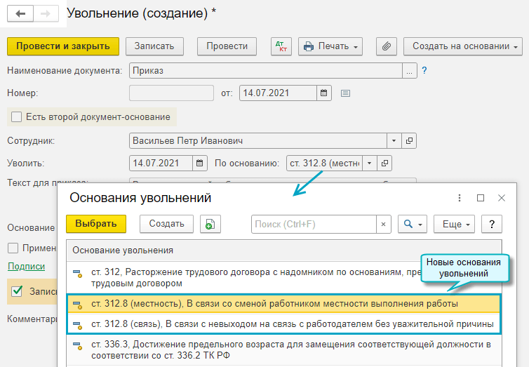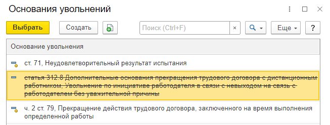 Добавлена возможность указать неиспользуемые основания увольнений сотрудников.