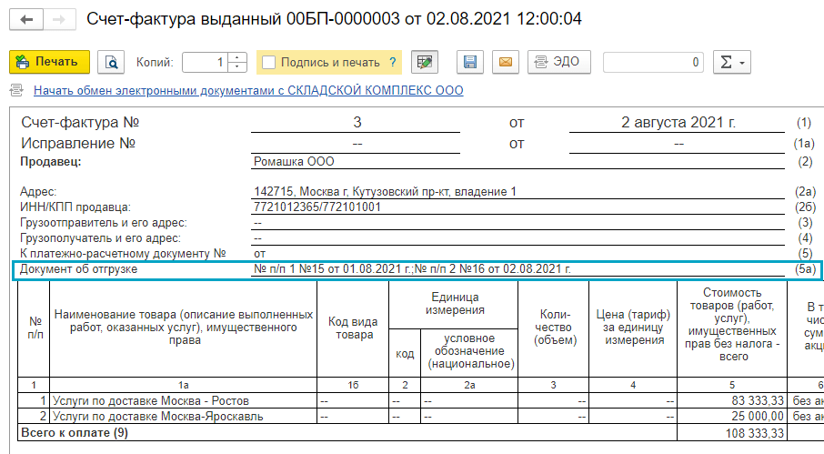 Добавлена возможность указать в счет-фактуре на реализацию номера документов об отгрузке, отличные от номеров документов-оснований. В УПД номер документа об отгрузке не редактируется, совпадает с номером УПД.