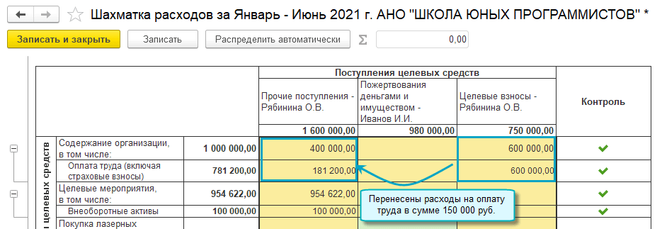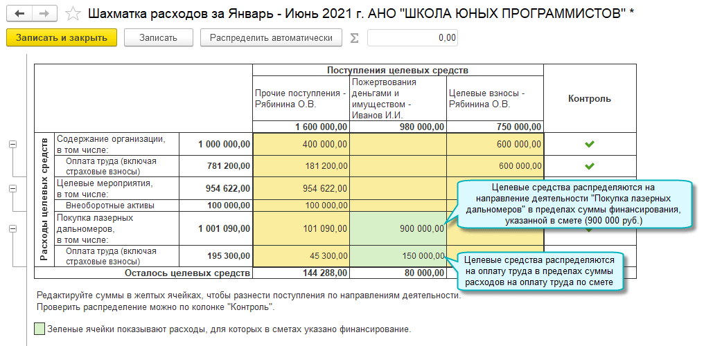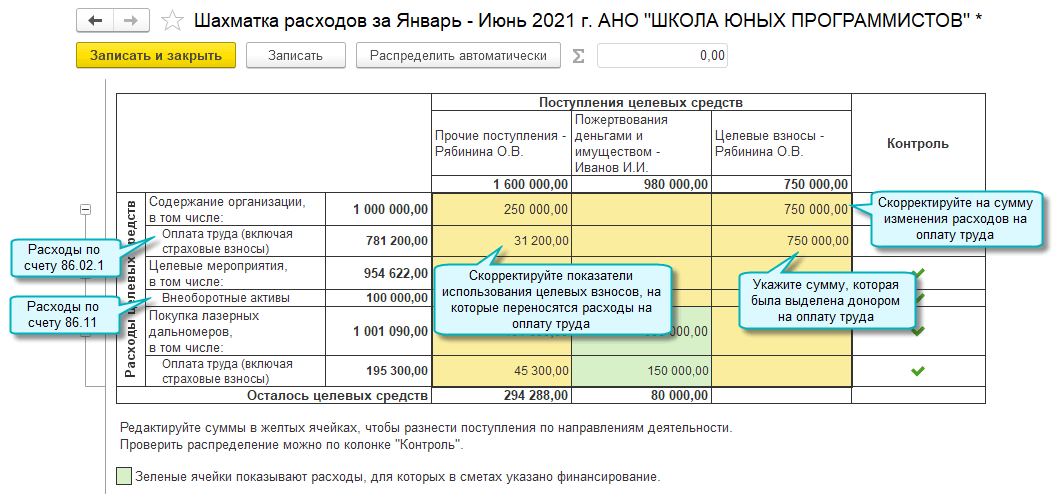 При распределении целевых взносов по направлениям деятельности учитываются источники финансирования, указанные в сметах. При этом не допускается финансирование расходов на оплату труда сверх суммы, указанной в смете. Распределение выполняется регламентными операциями по закрытию счета 86 "Целевое финансирование".